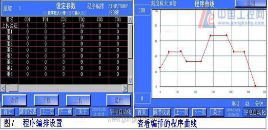 對于518P、708P、808P程序參數設置,點擊【A】框,進入【手/自動、編程設置控制平臺】;圖5所示的編程界面:出現【通道一程序編排設置】;程序編排平臺用組別配方來設置程序段【C01】和【T01】表示,以【組1】為例:點擊選中【組1】點擊組名【C01】下面的數據框輸入溫度值【250】(注:在溫度欄C01輸入的數值要放大10倍如25℃輸入的數據是【250】放大10倍);點擊組名T01下的時間段寫入實際時間值分鐘如15分鐘寫入【15】;設置好程序配方選中配方組如:【組1】在菜單條中點擊【查看】可看到已編排的曲線圖形;點擊【返回】;選中編輯好的配方組【組1】點擊【下載】操作,已編排的程序就下傳給程序儀表;即時可操作【運行】【停止】【暫停】【手動】【自動】【返回】。采用【上傳驗證】儀表中的程序曲線來檢驗程序是否下傳,程序配方可保存15組程序在觸摸屏中。圖7